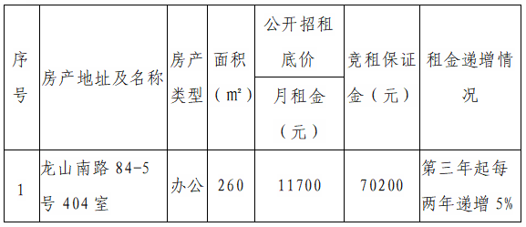 根據(jù)國有企業(yè)資產(chǎn)出租管理相關(guān)制度,我司決定對位于龍山南路84-5號404室房產(chǎn)對符合入駐條件的意向承租人進行公開競價招租,具體信息如下: